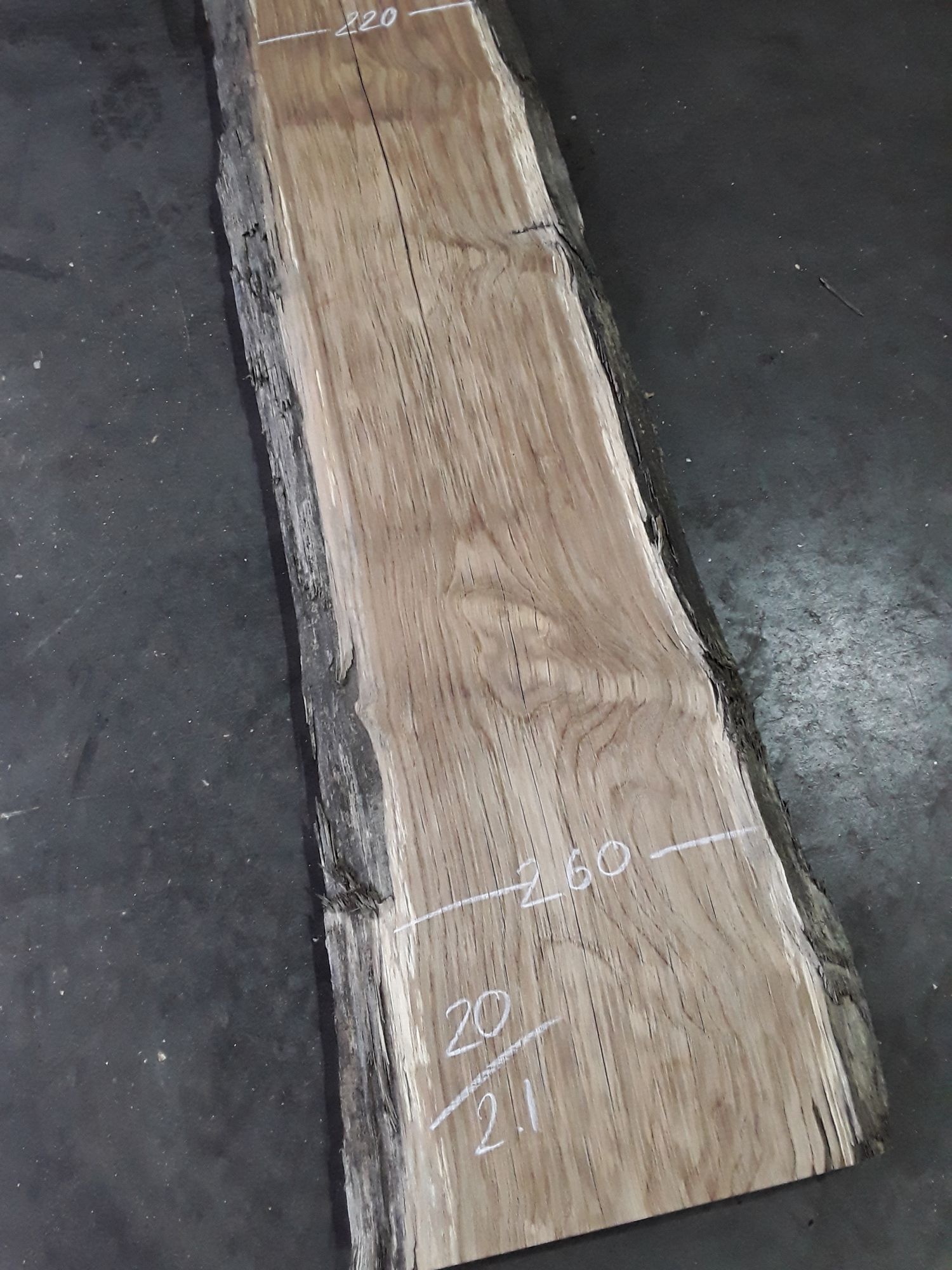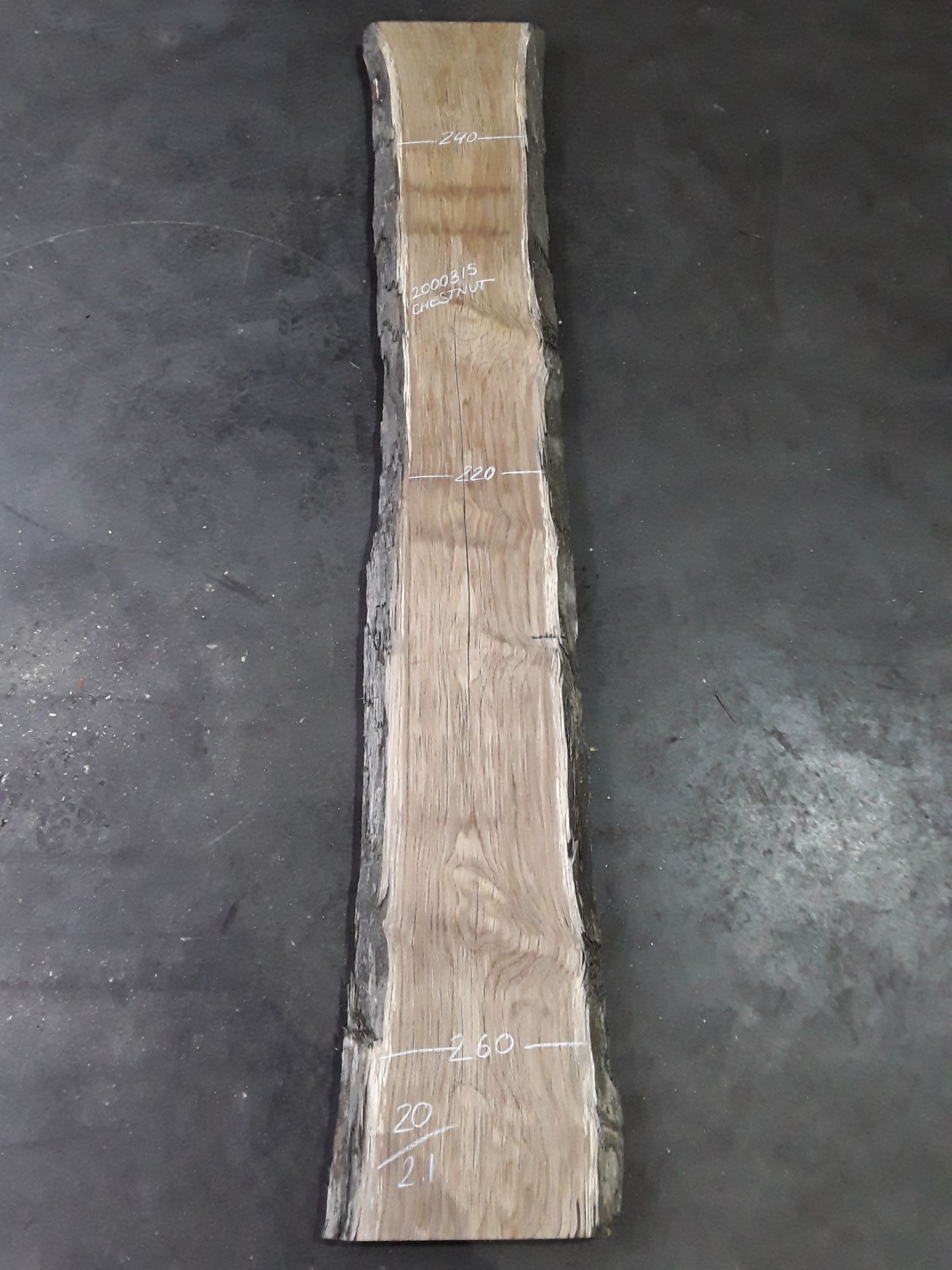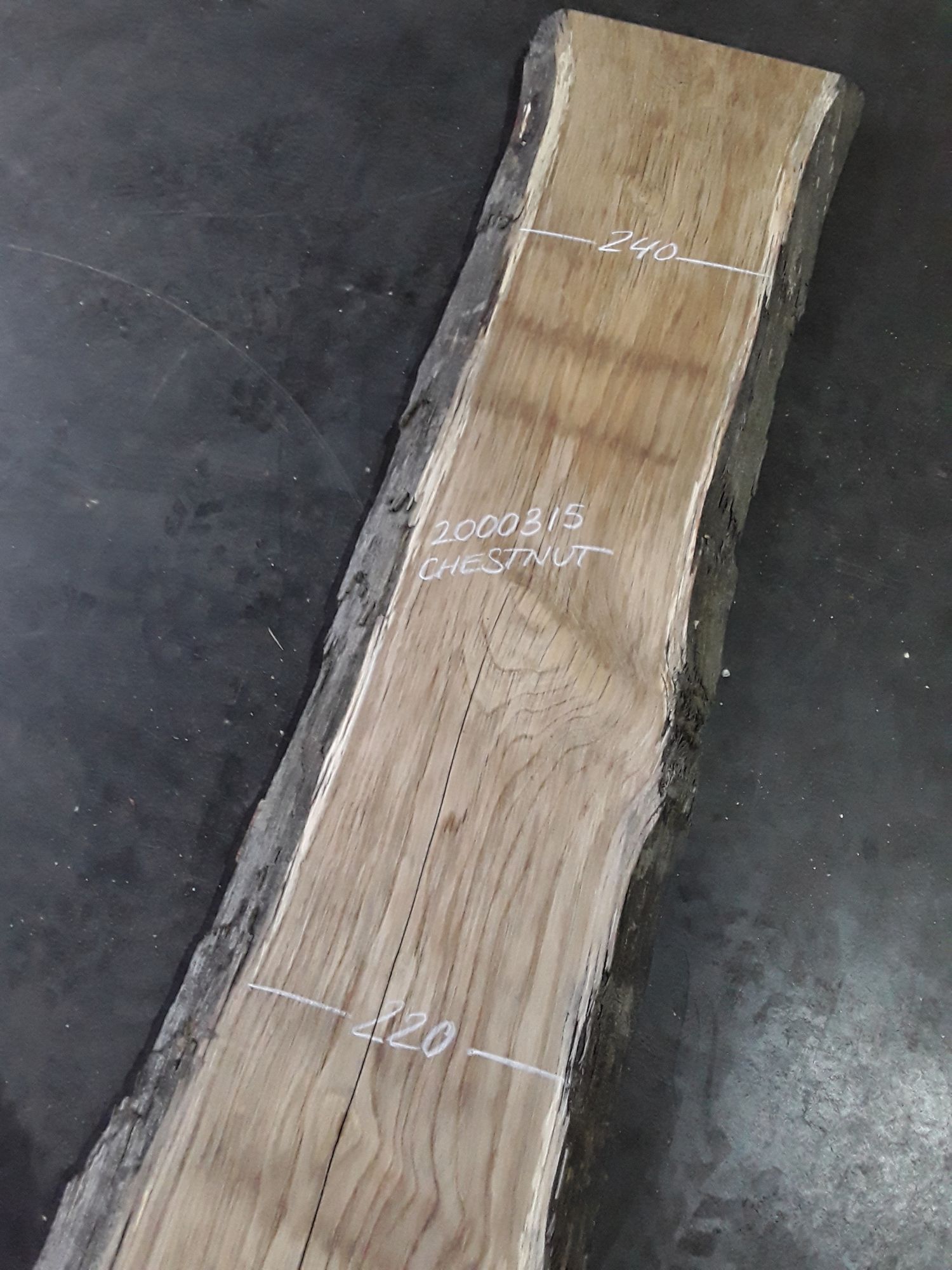European chestnut, two waney edges, interesting dark colour, lighter on underside, planed on both faces, slight hit and miss