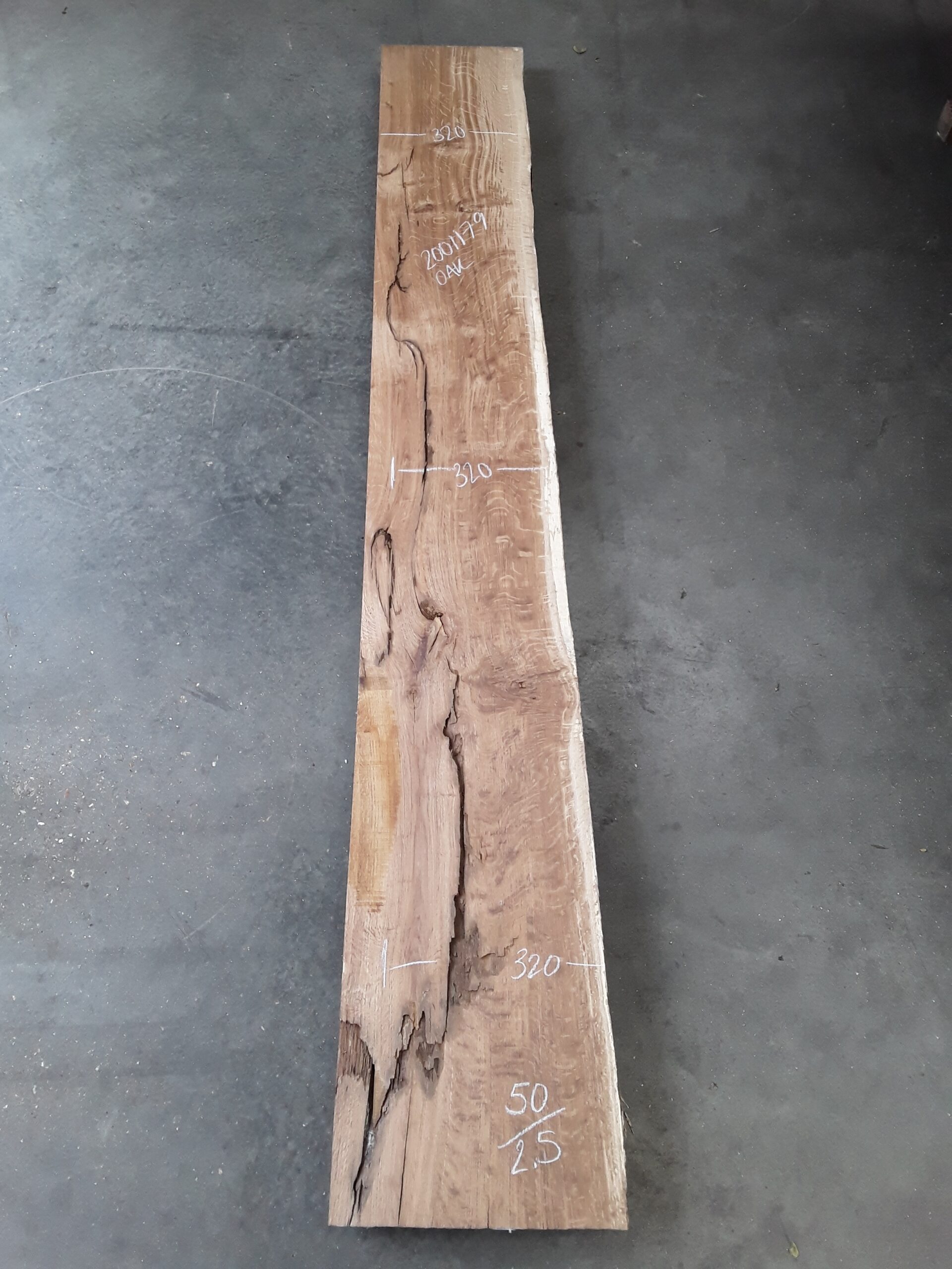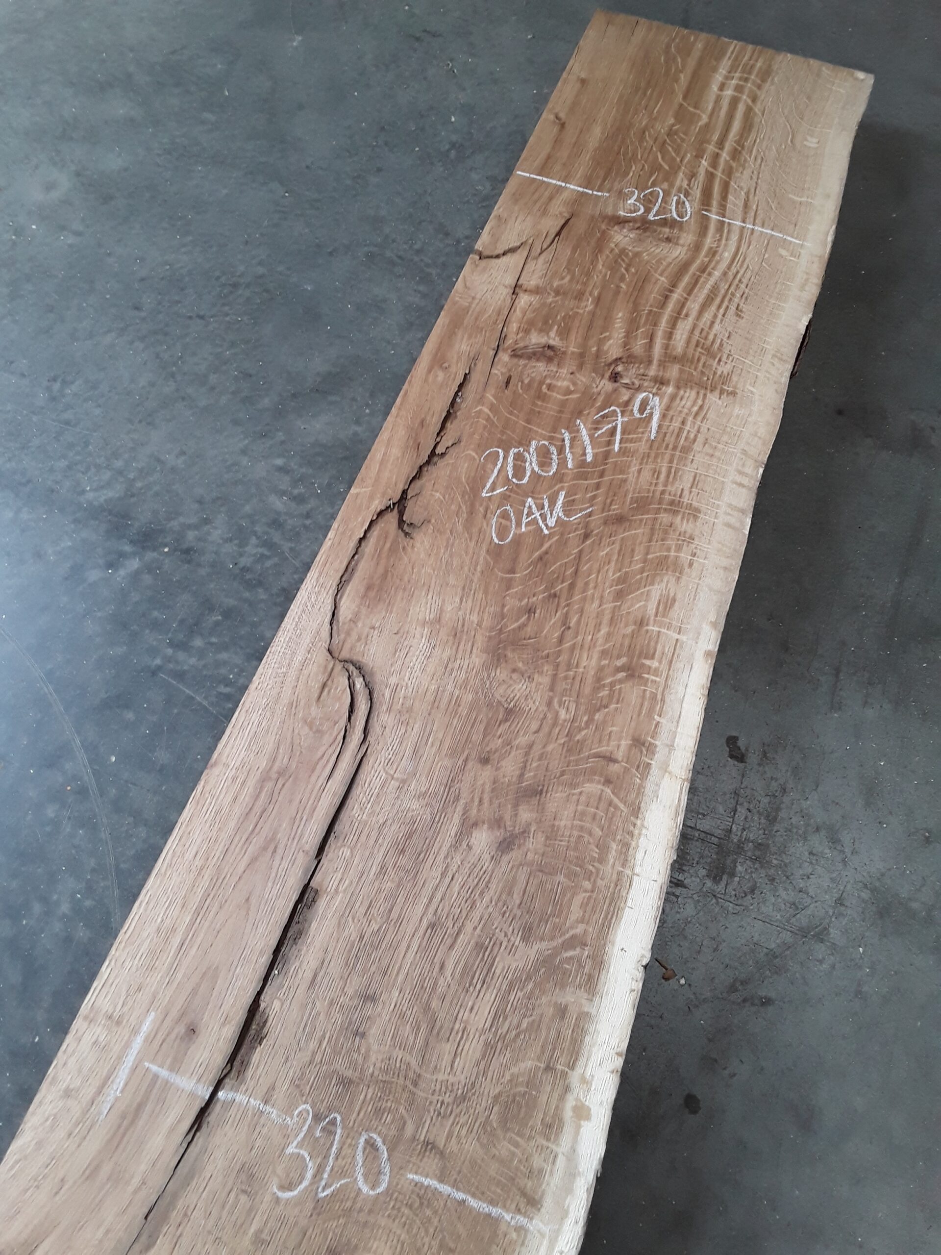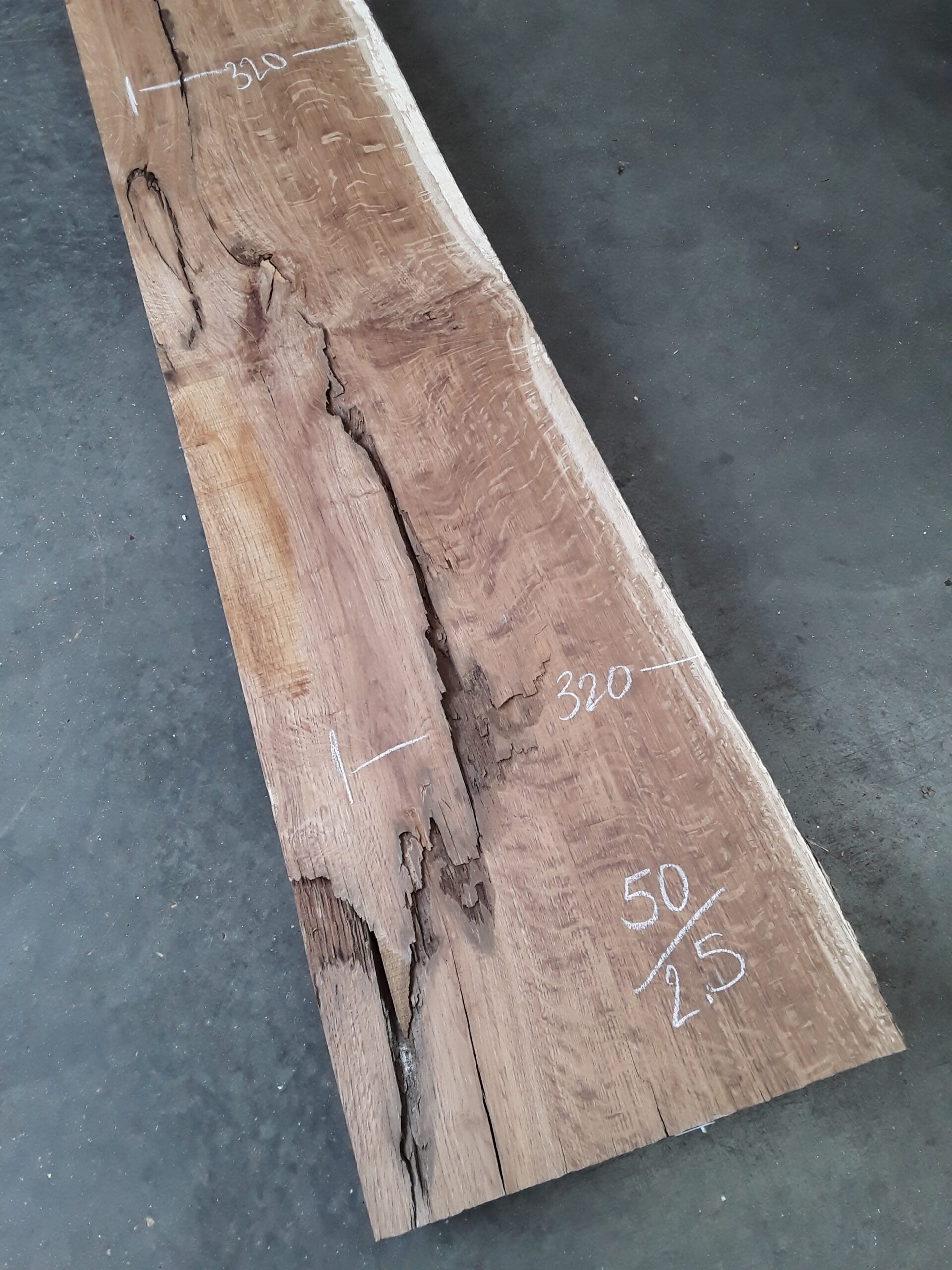 French oak, one waney, one rough square edge, great colour and grain, planed on both faces, some hit and miss, splits fairly substantial, perfect for resin