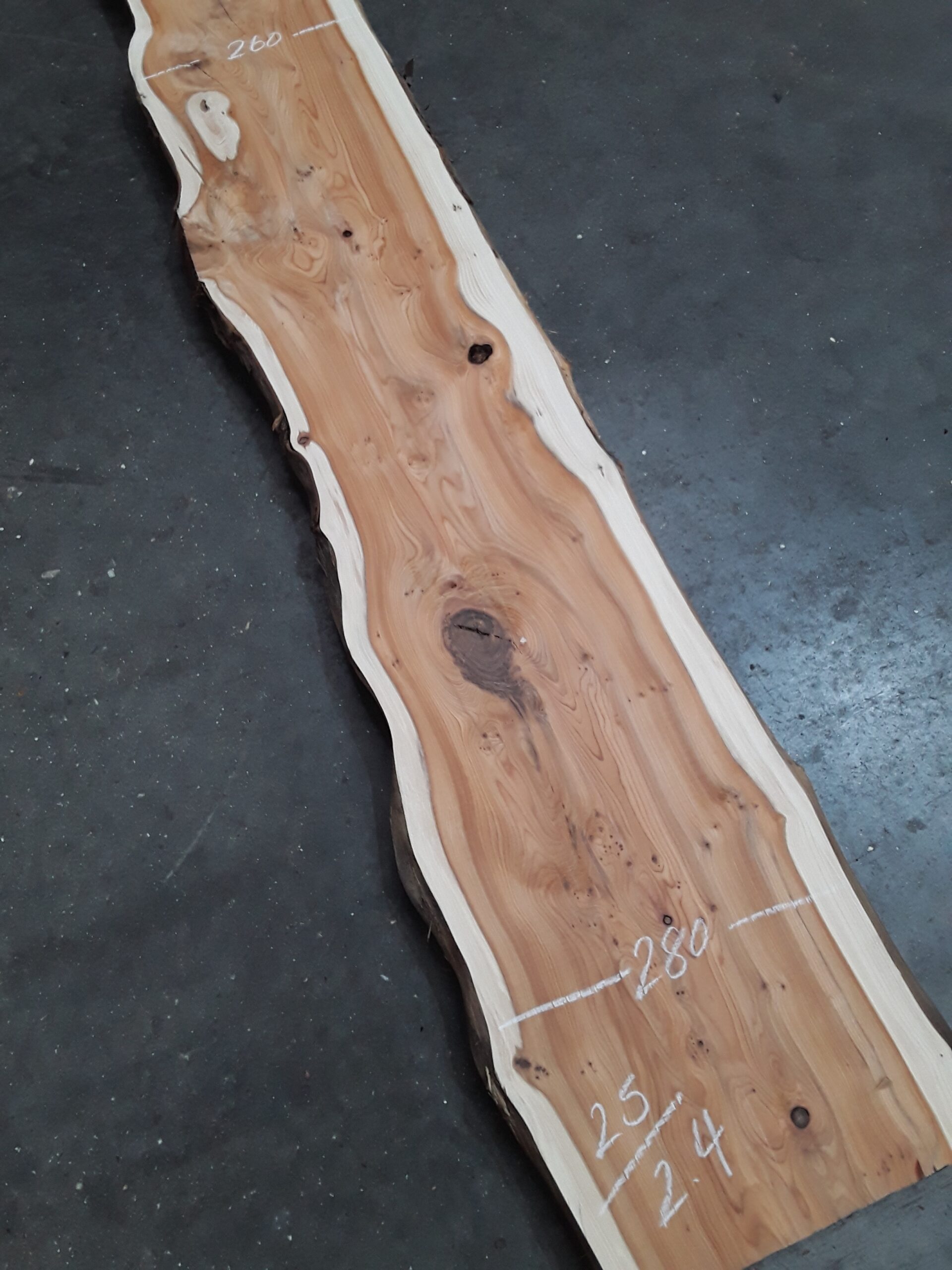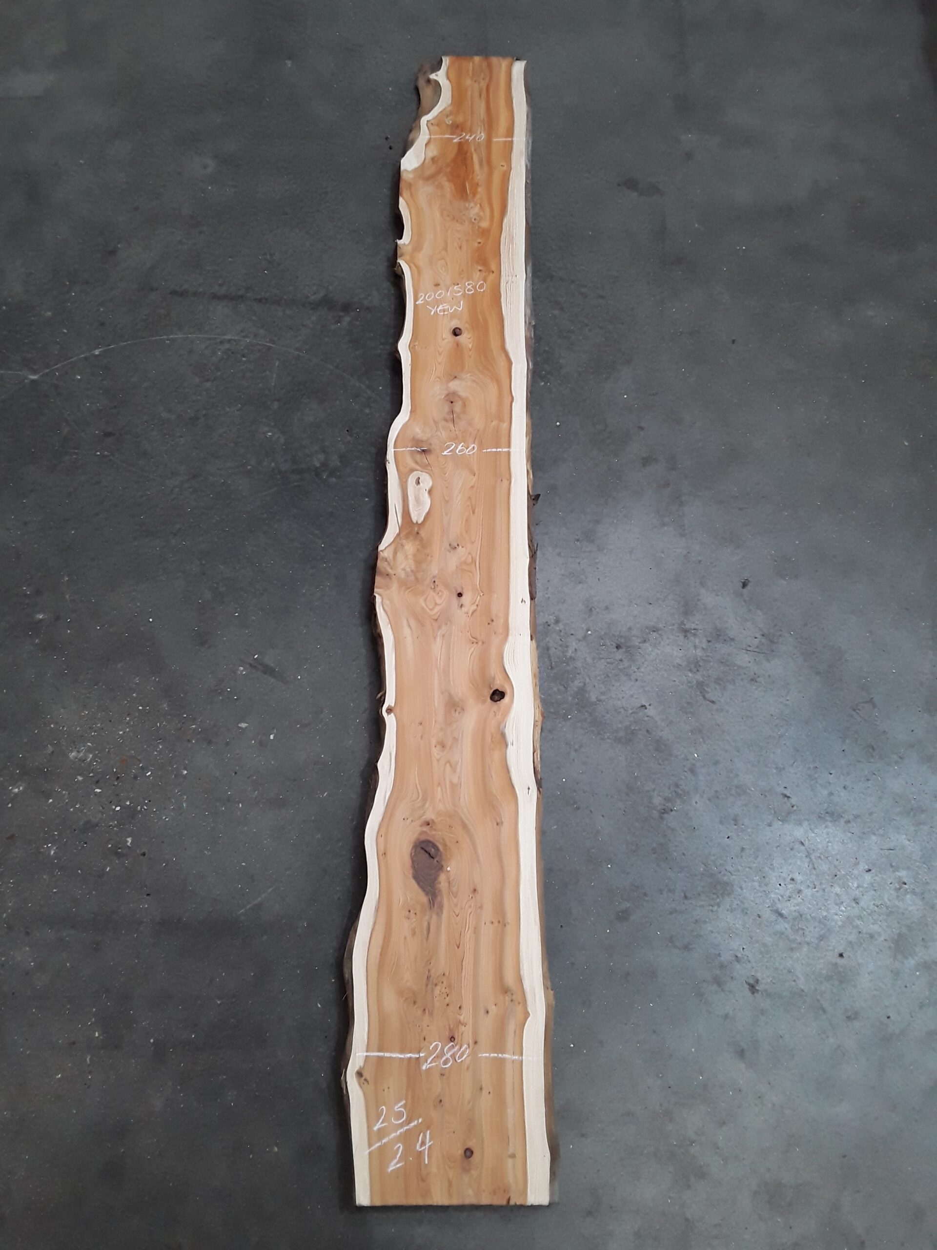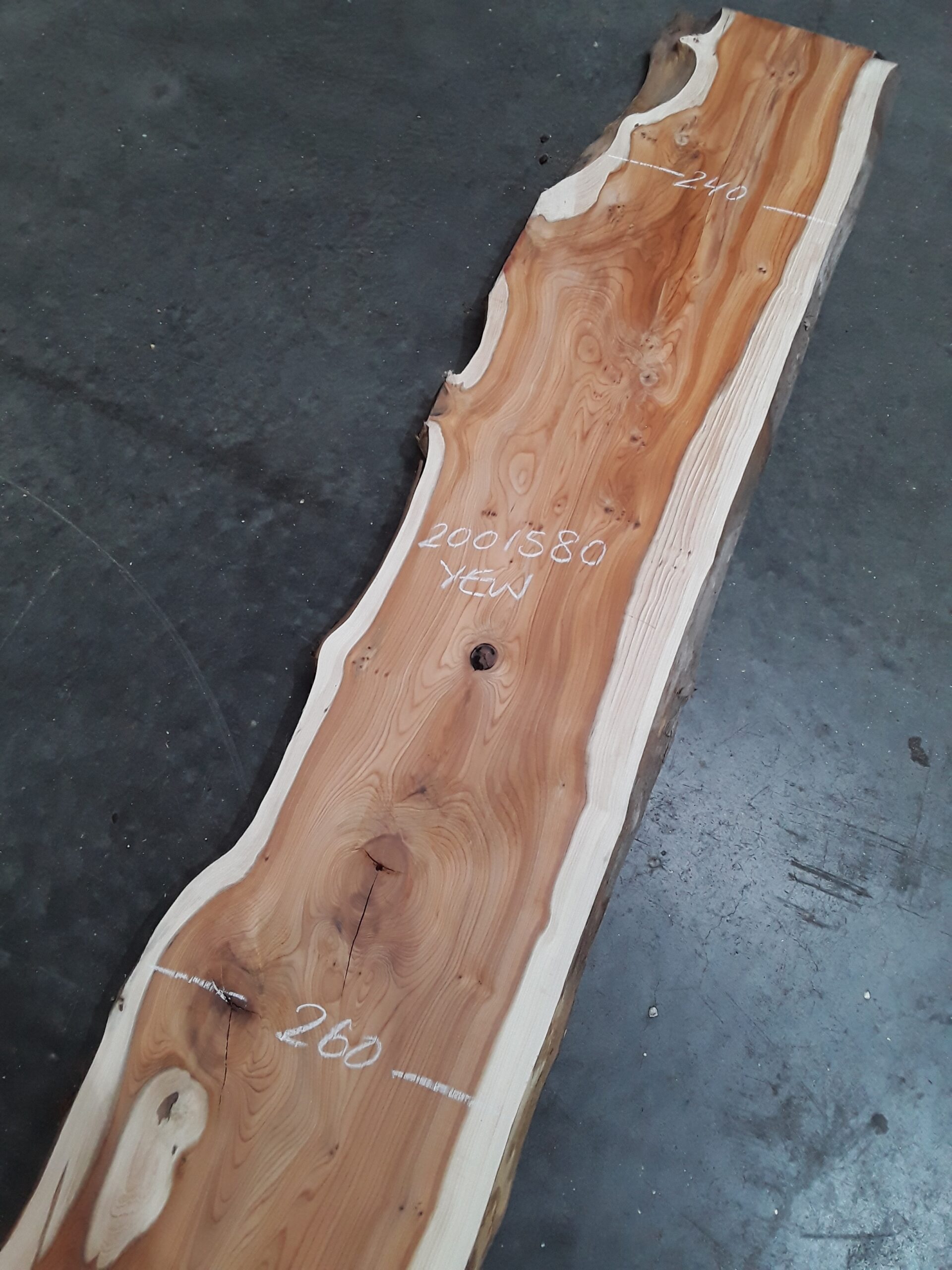 English Yew, two waney edges, great character and colour, planed on both faces, slight hit and miss, some splits