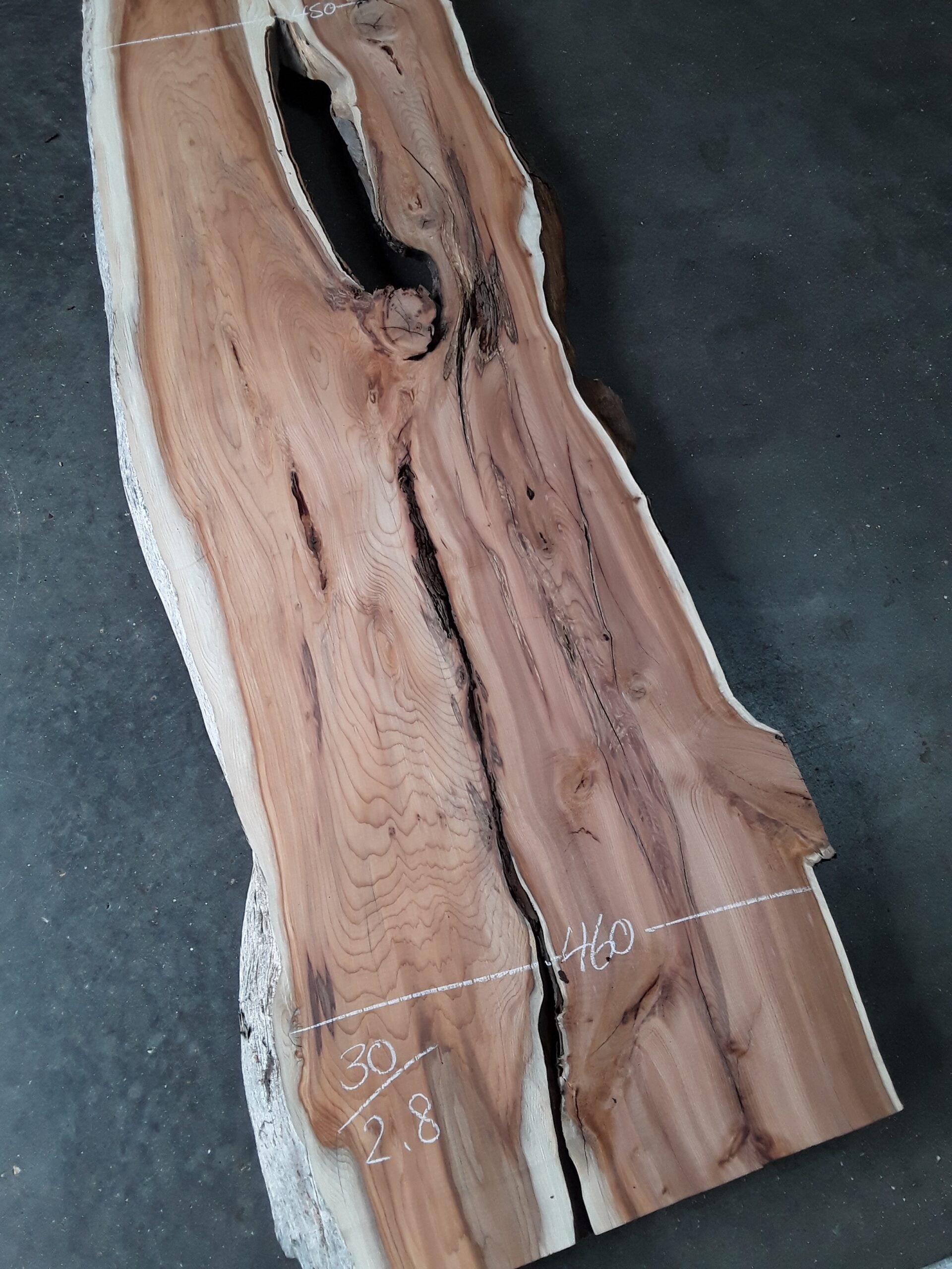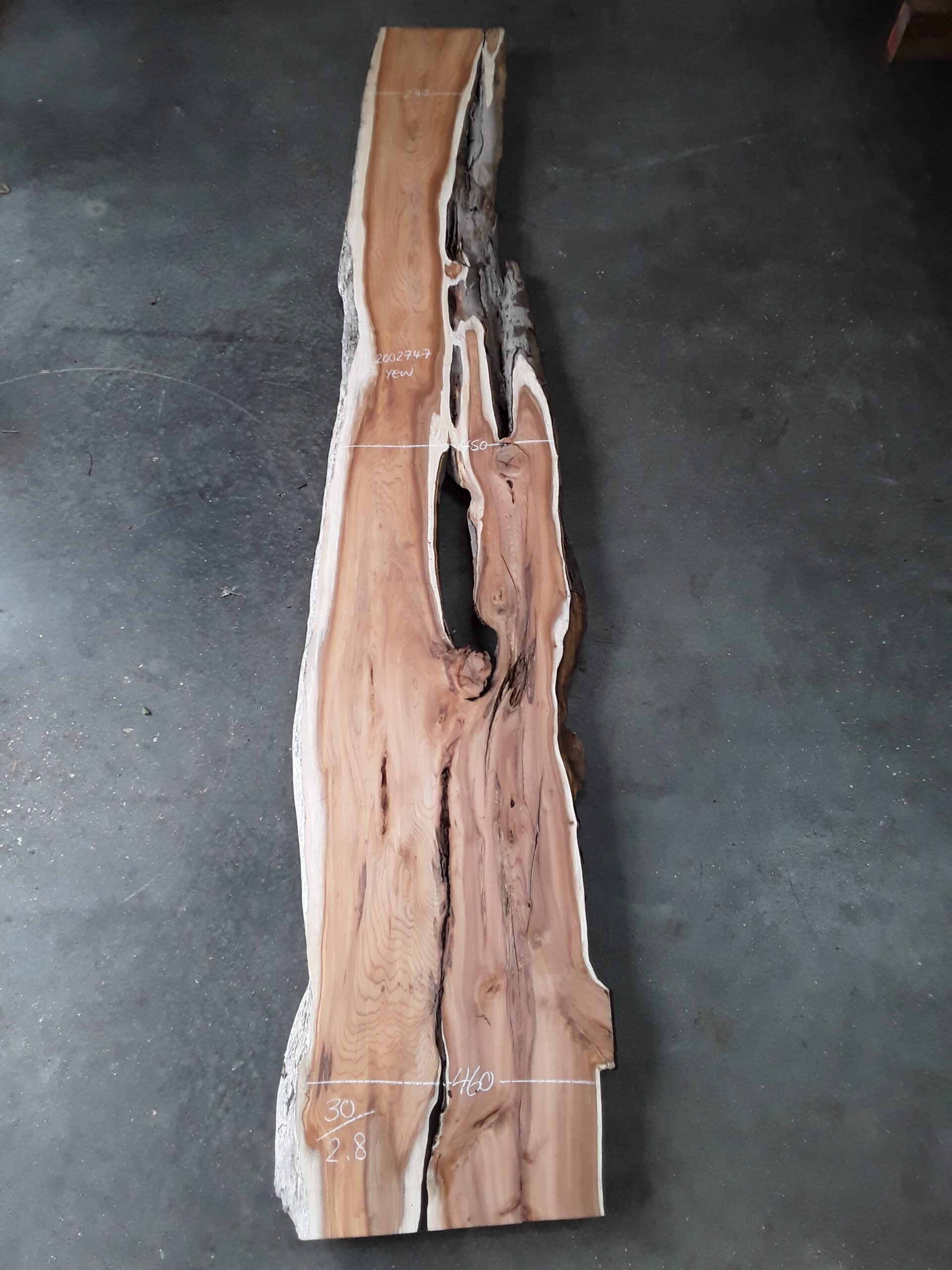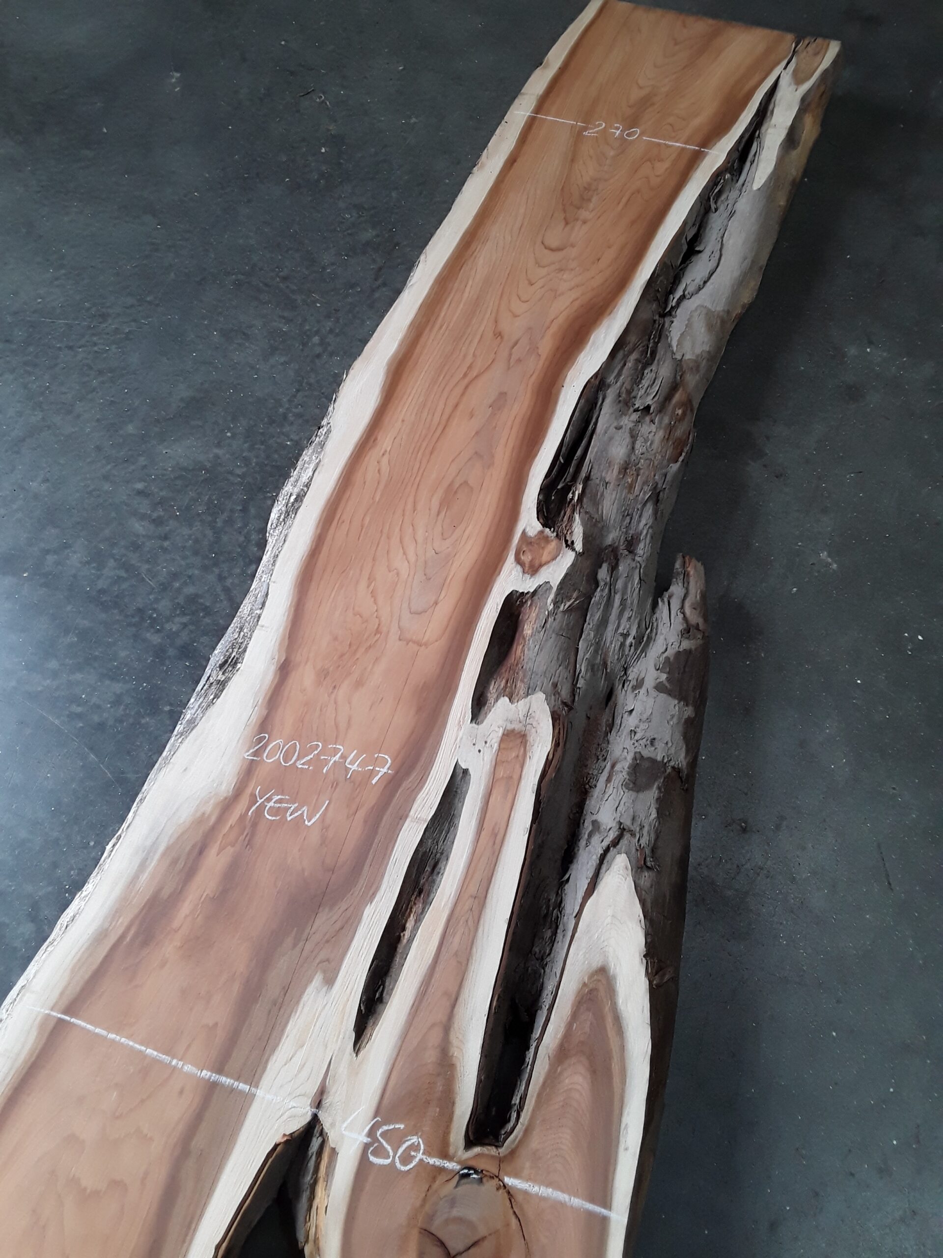 English Yew, two waney edges, stunning colour and grain, planed on both faces, slight hit and miss, some splits and areas of decay.