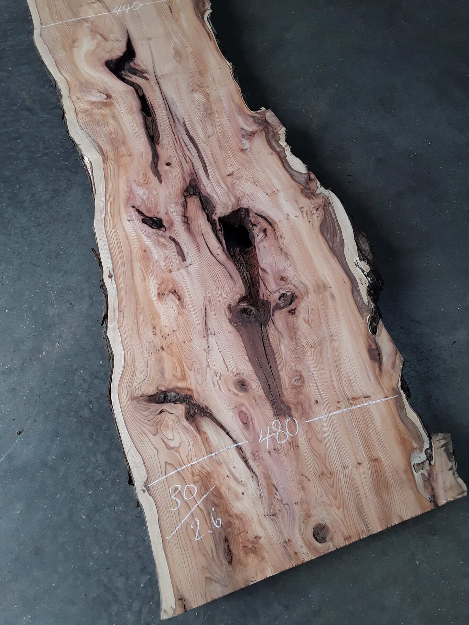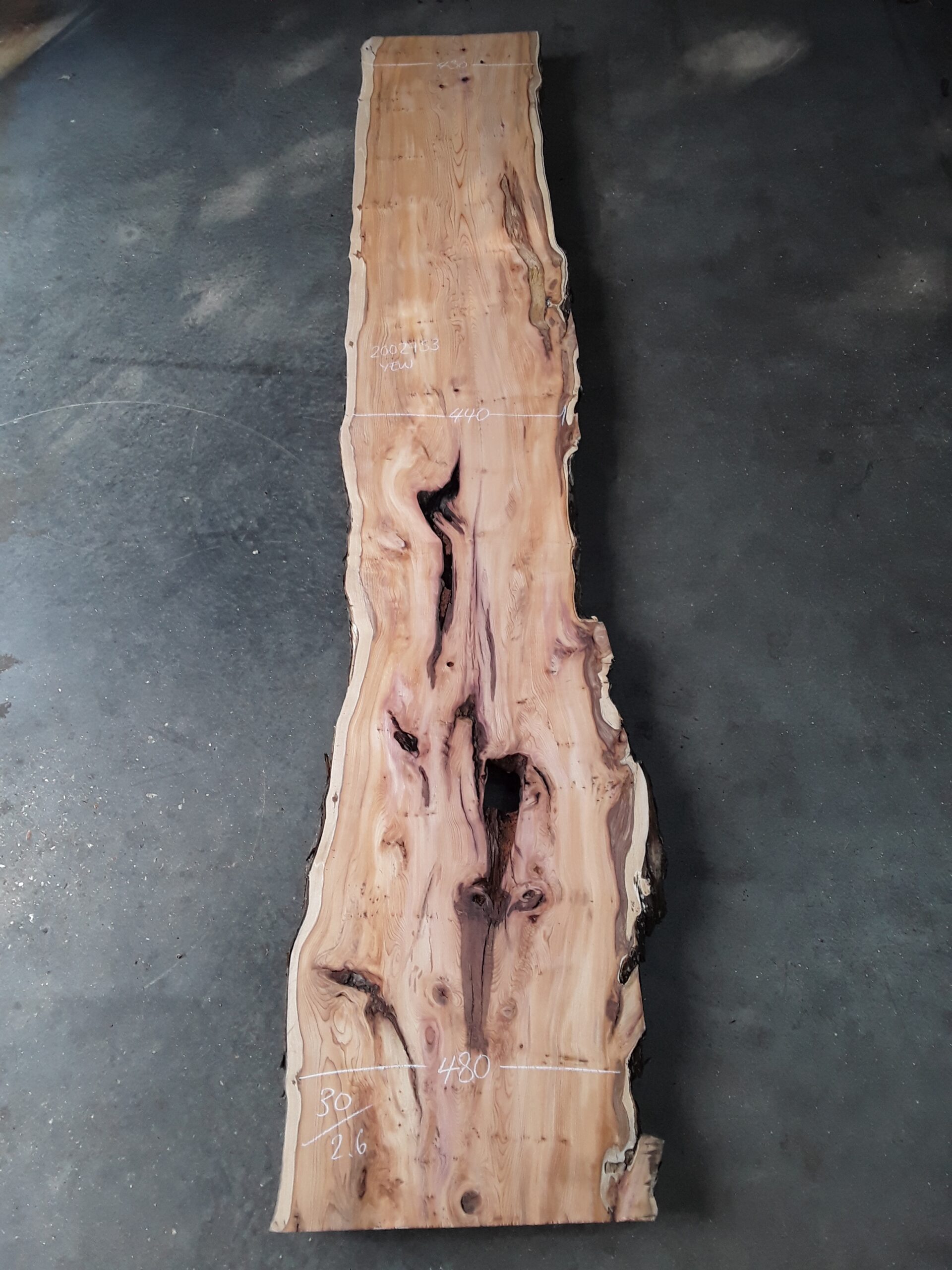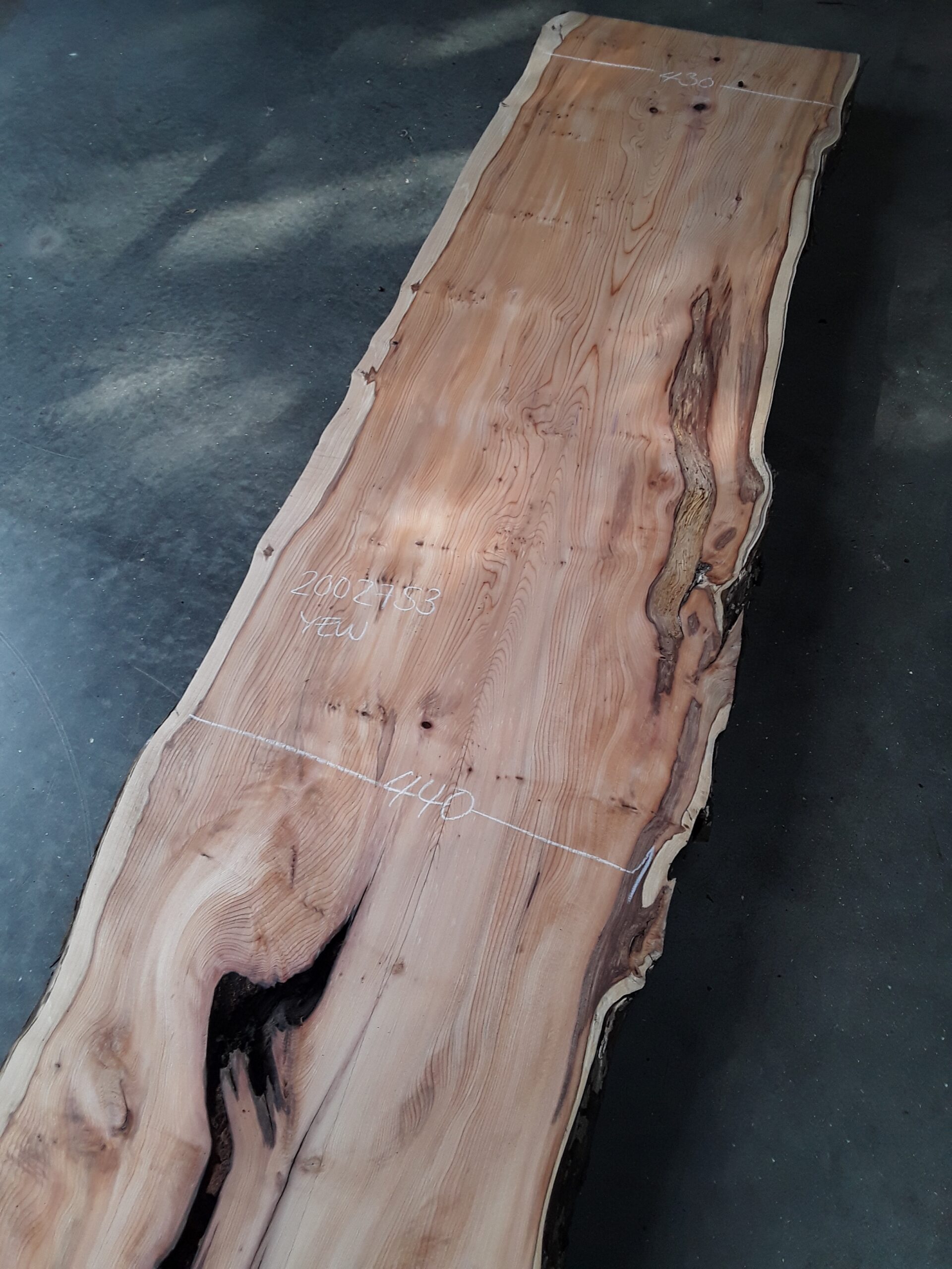 English Yew, two waney edges, great character and grain, planed on both faces, slight hit and miss, some splits and areas of decay