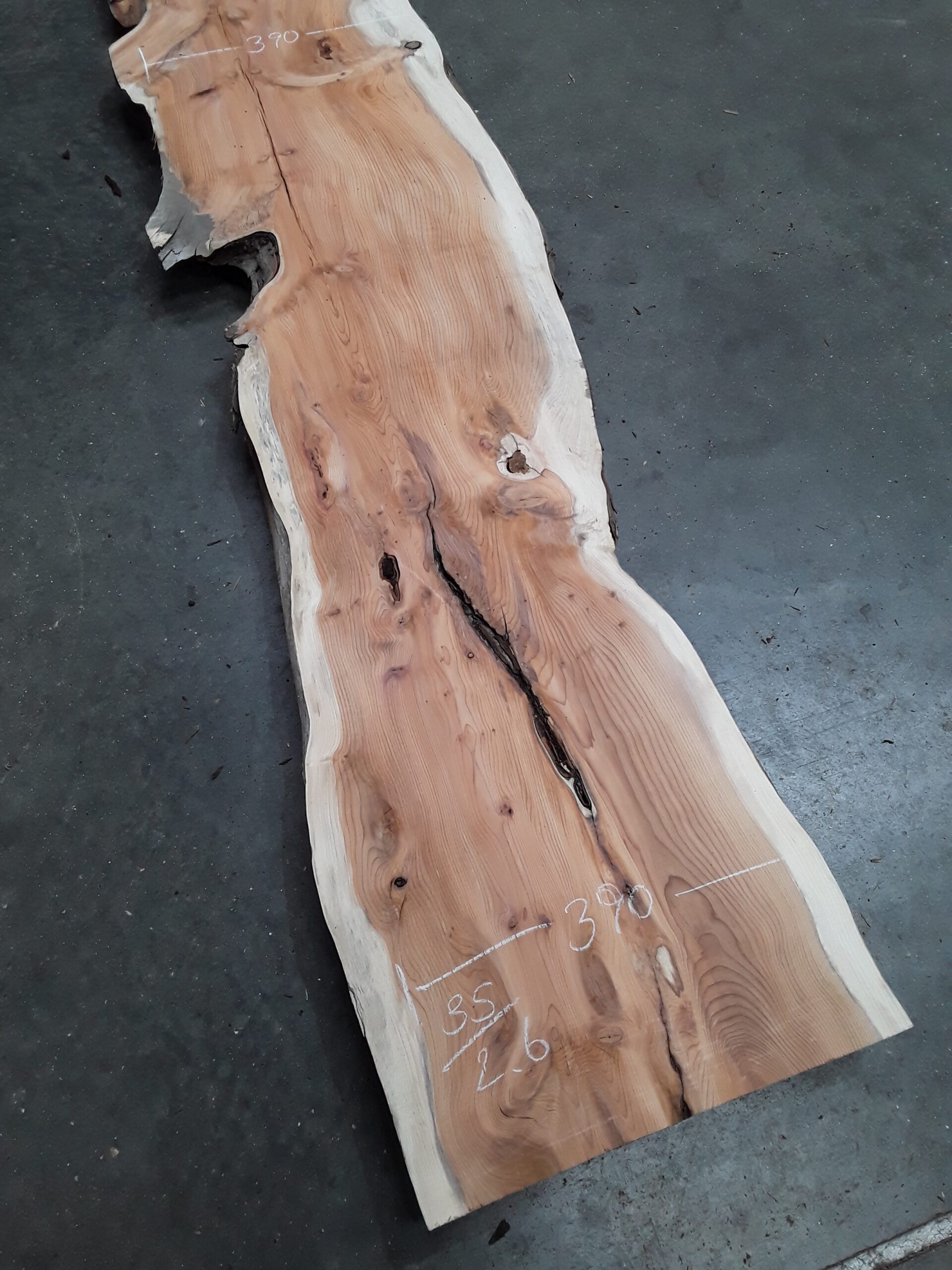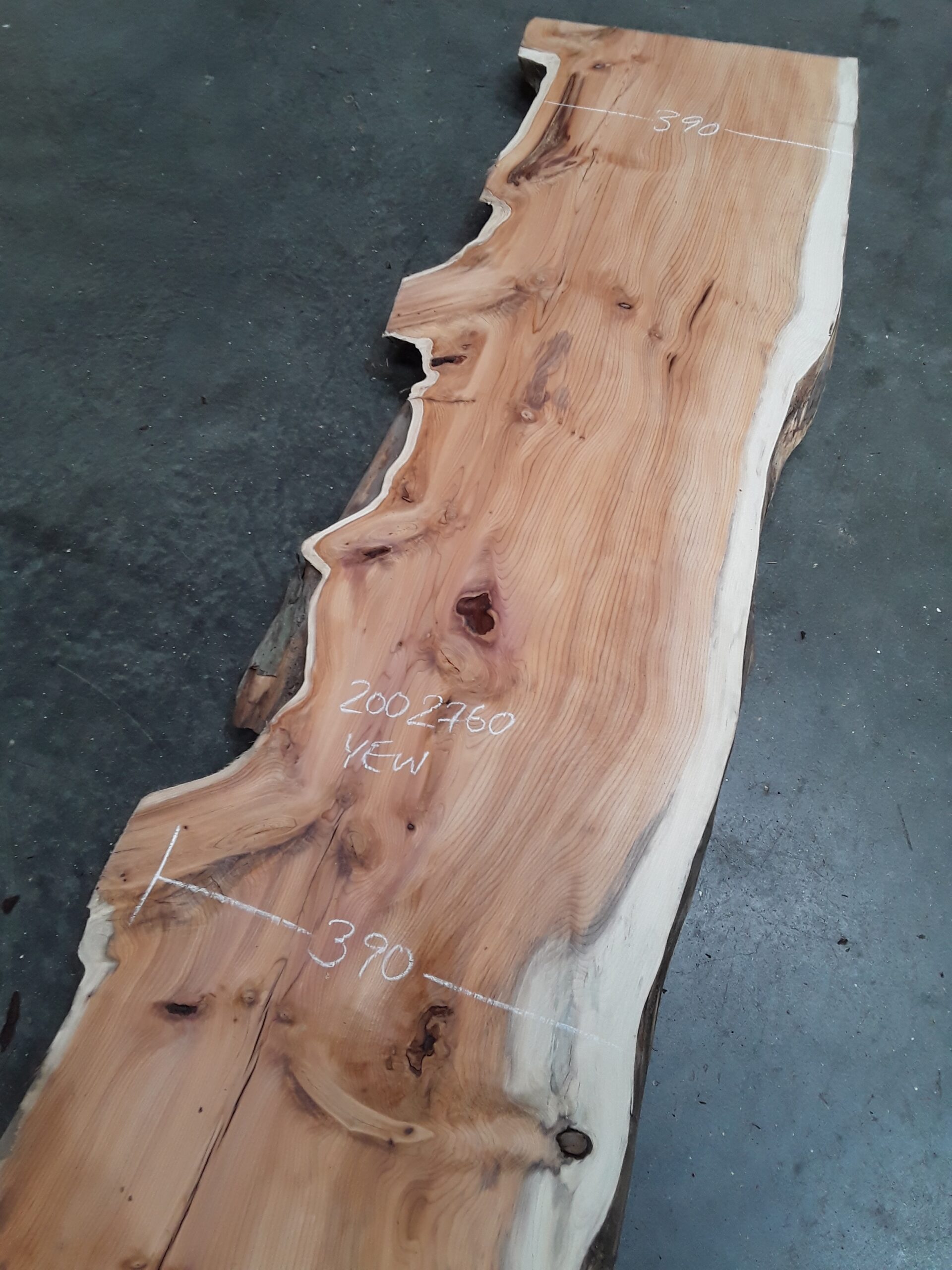 English Yew, two waney edges, great colour and grain, planed on both faces, slight hit and miss, some splits