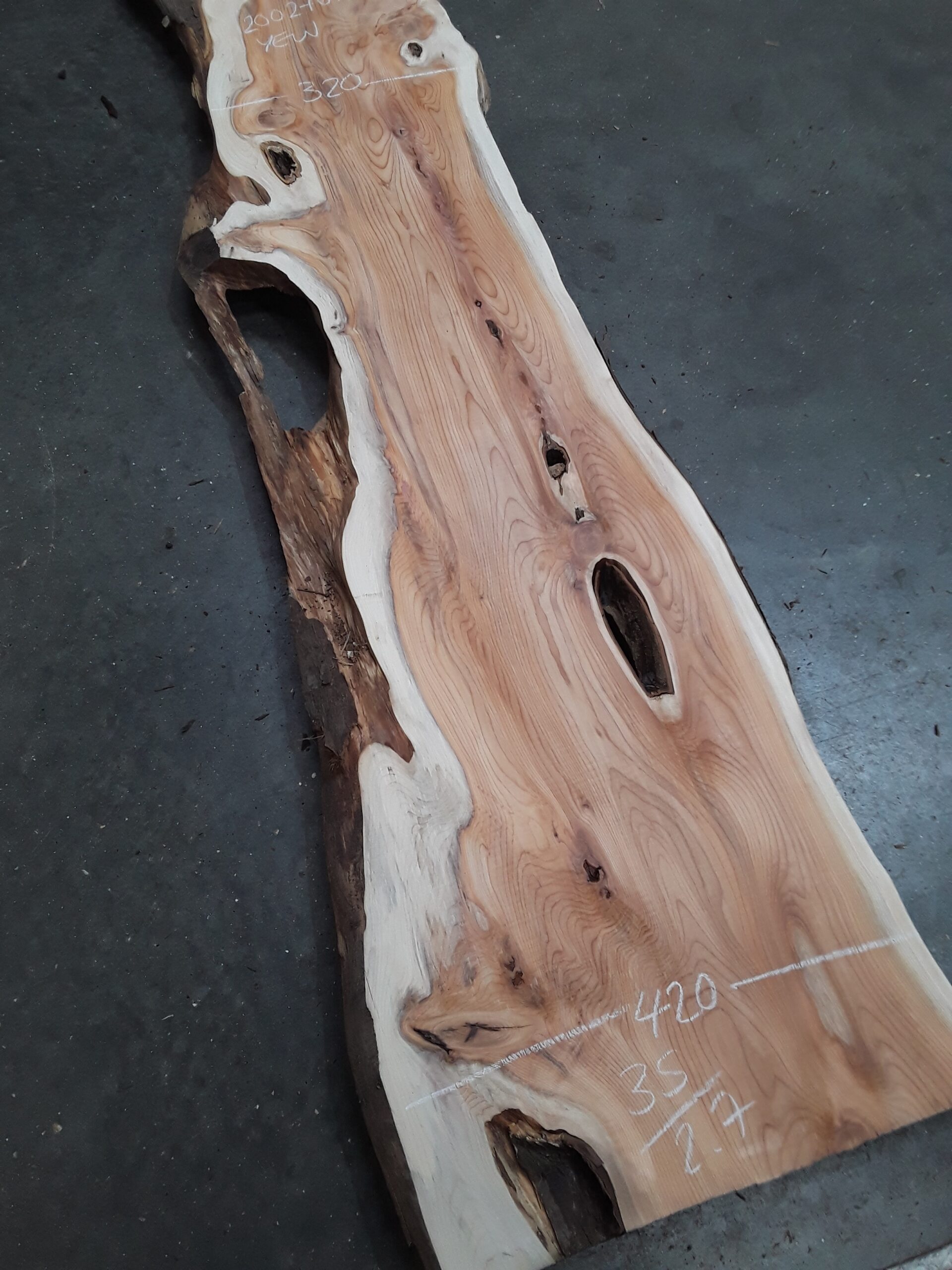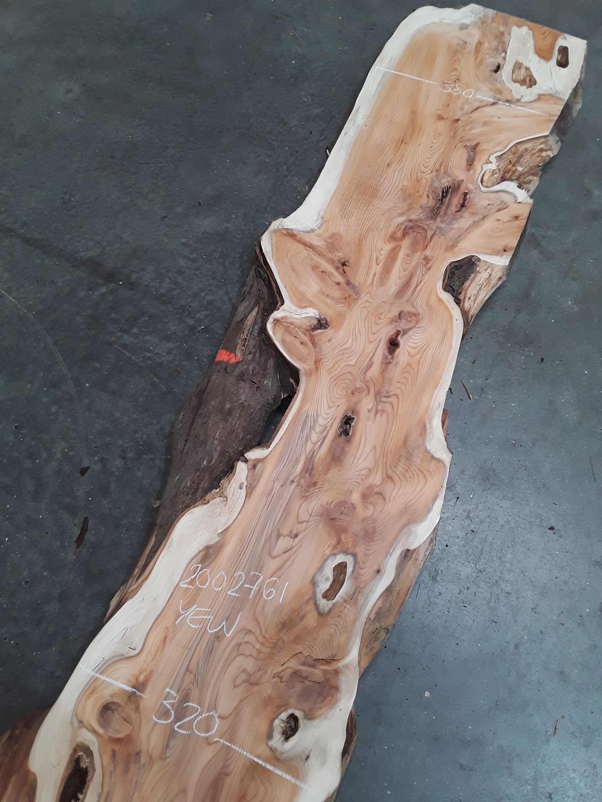English Yew, two waney edges, great character and colour, planed on both faces, slight hit and miss, some splits